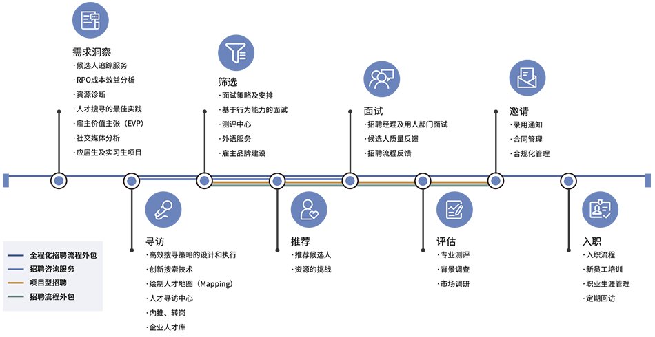 有針對性地提供部分或全流程招聘外包服務。作為一家專業(yè)的招聘流程外包服務商,我們旨在整合戰(zhàn)略、技術、資源及供應商管理,以提供高效招聘流程服務。在服務過程中,我們將作為企業(yè)戰(zhàn)略合作伙伴與你的內(nèi)部團隊緊密合作,通過流程設計、制定招聘戰(zhàn)略、人才尋訪、人才選拔、招聘決策、辦理入職、技術協(xié)調(diào)及核心業(yè)務數(shù)據(jù)的匯報等服務,幫助企業(yè)提升招聘效率,提高招聘質(zhì)量,同時降低招聘成本。